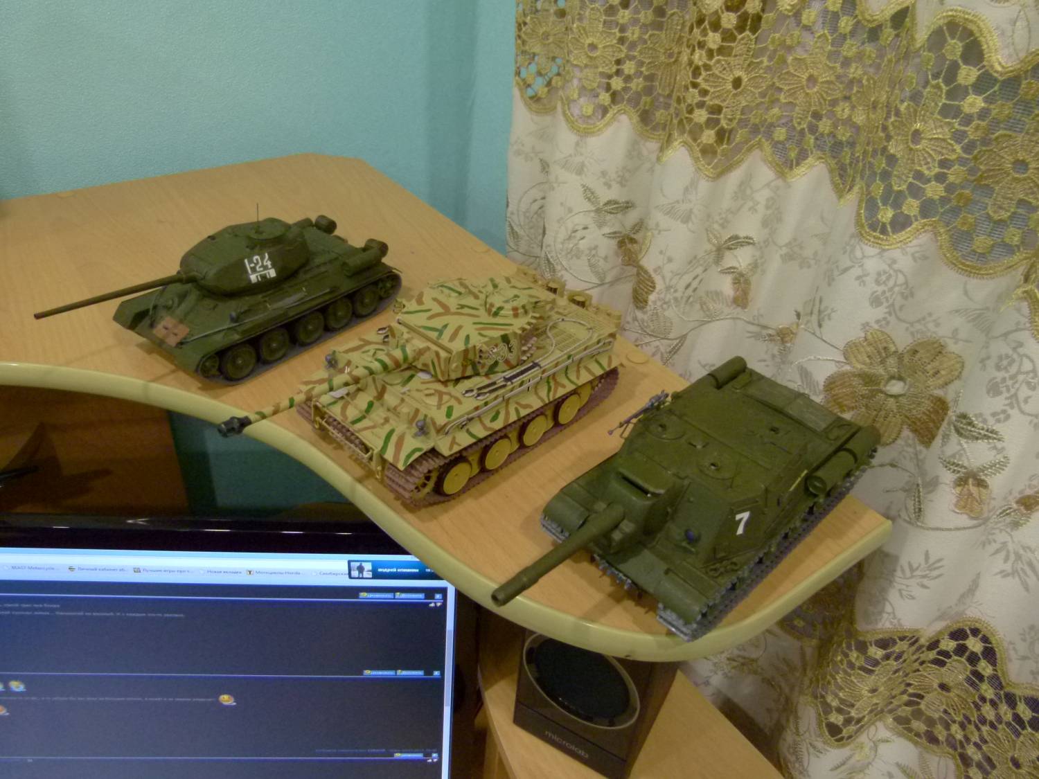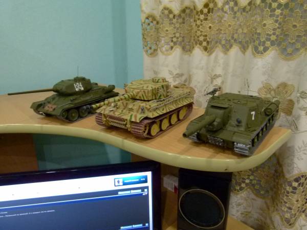 | Fantom_ussr, спасибо!!! AlexGuard, всё зависит от самой модели! Допустим с 34-кой ушло около 2 дней, точнее вечера, так как там мало мелких деталей было, два корпуса и всё. С ИСУ было уже посложней, один только пулемёт я склеивал целый вечер, плюс модель делалась с вращаюсимися траками. А вот Тигр - эта целая эпопея!!! Такого количества мелких деталей нет наверное ни в одной модели, на него ушёл месяц, плюс покраска!!! Но за то это моя любимая модель из колекции!!! На очереди Фердинанд и скорее всего ИС-2. Очень хочу найти Тигра II, но к сожалению эта модель уже не выпускается...